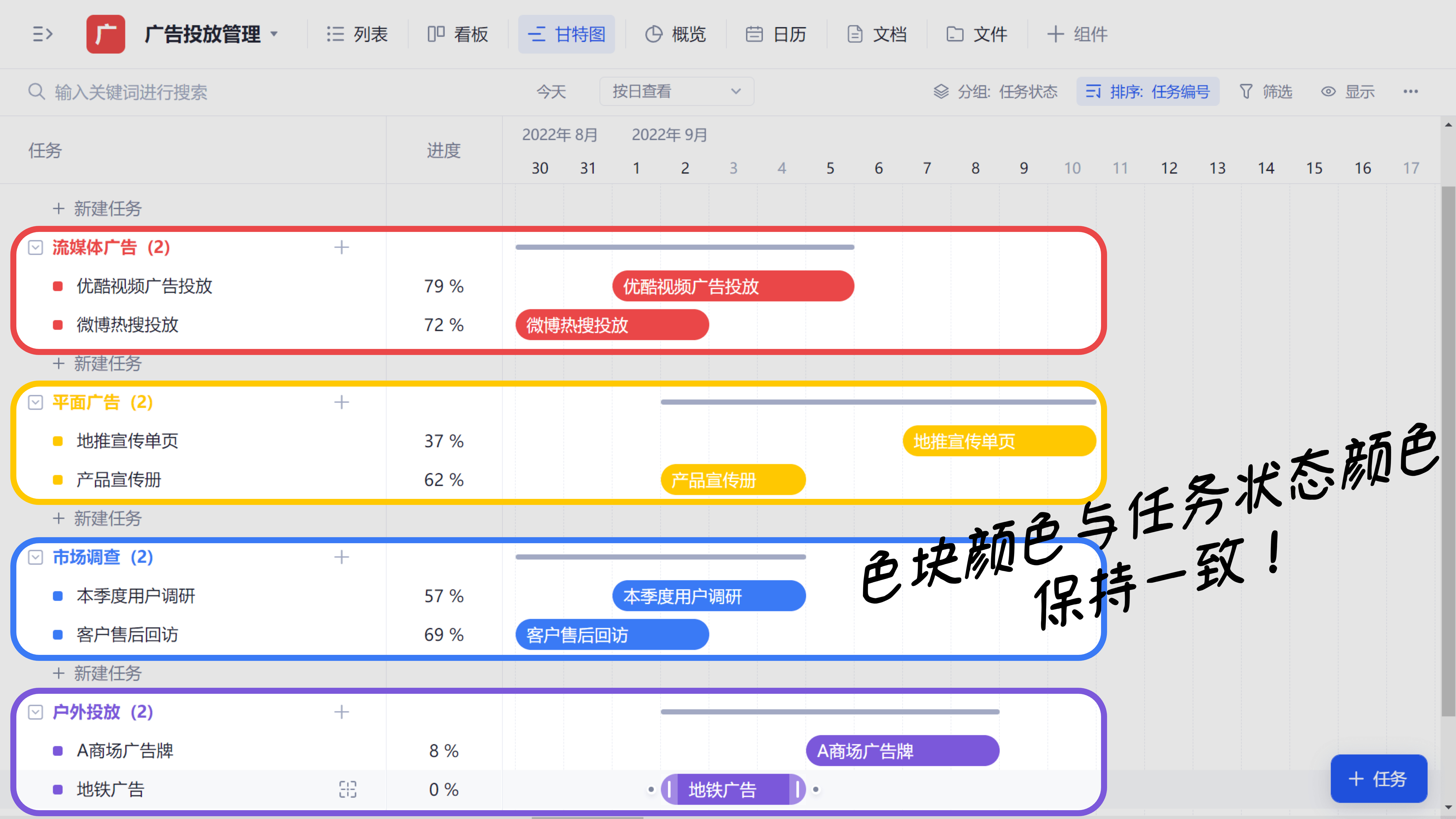 不同于以往Tracup中的甘特图色块默认蓝色,现在,色块的颜色会和左侧项目的颜色保持一致,项目状态是绿色,状态下的任务也都会换上绿色的马甲。