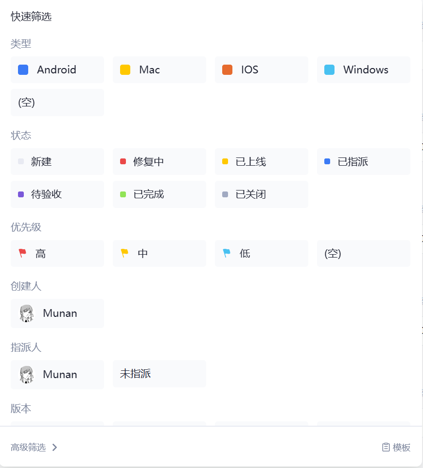 过滤器是一种可以通过自定义条件来筛选项目信息的工具。在Tracup中,用户可以通过过滤器按照各种维度来筛选所需的信息。以下是一些常用的过滤器: