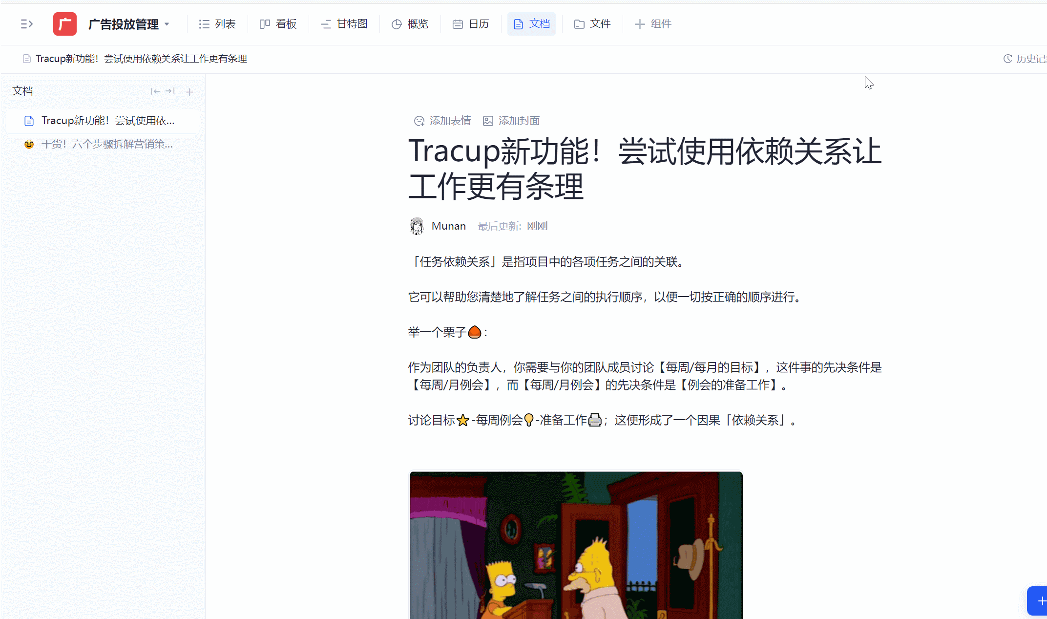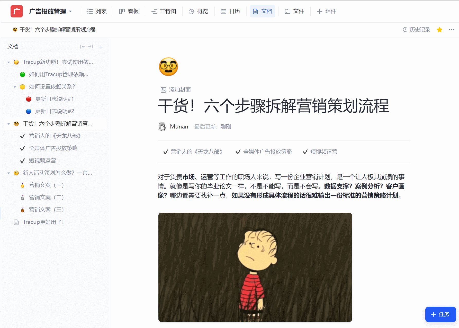 在**Tracup「文档」中,将每次复盘的会议记录保存在团队空间之中,安全、稳定的同时又能确保每个成员点开项目就能随时查阅到过往的文档。**