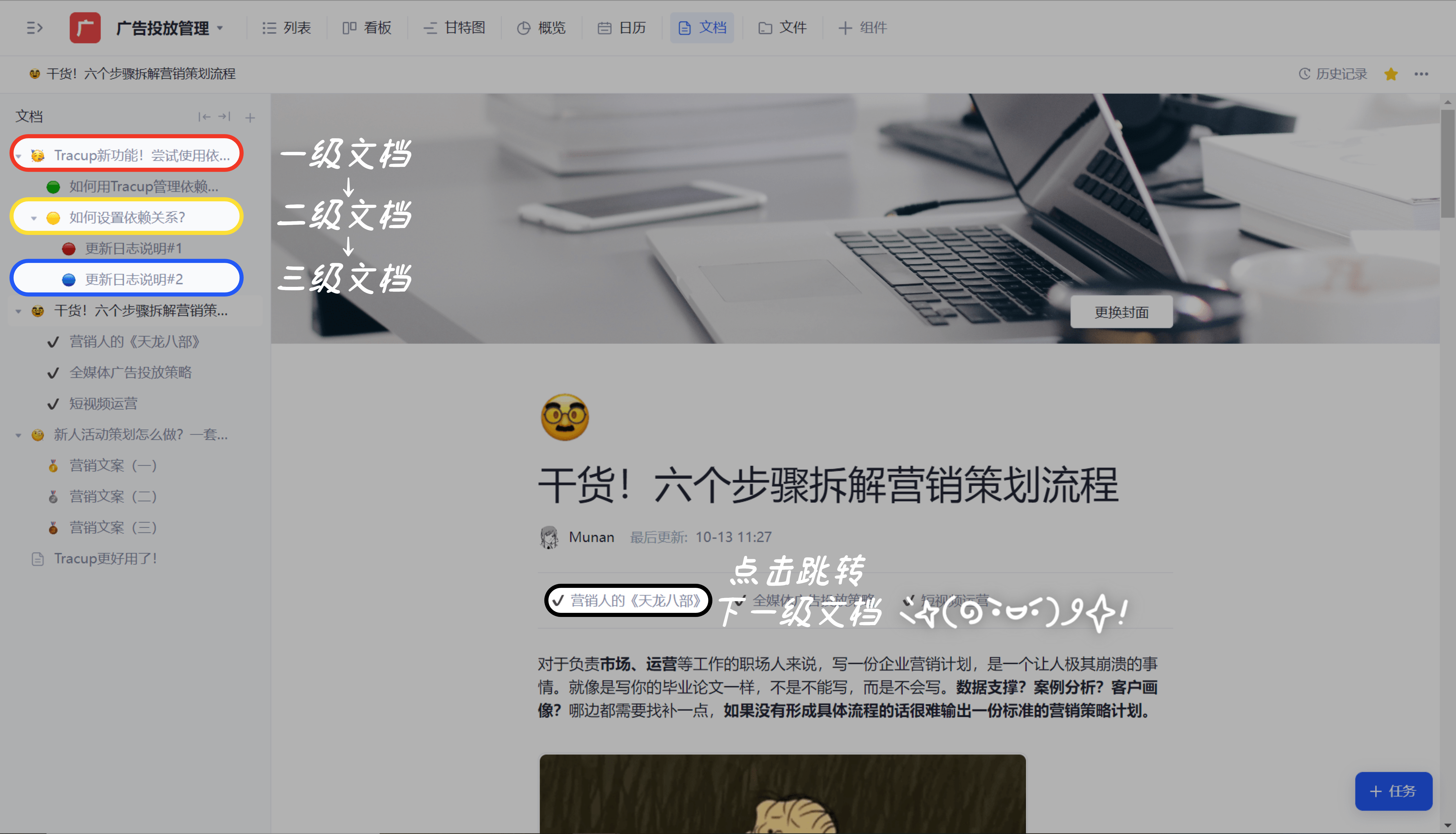 另外,**Tracup「文档」支持目录分级。类似于文件夹,你可以在上一级文档中查看下一级文档,点击即可跳转查看。**