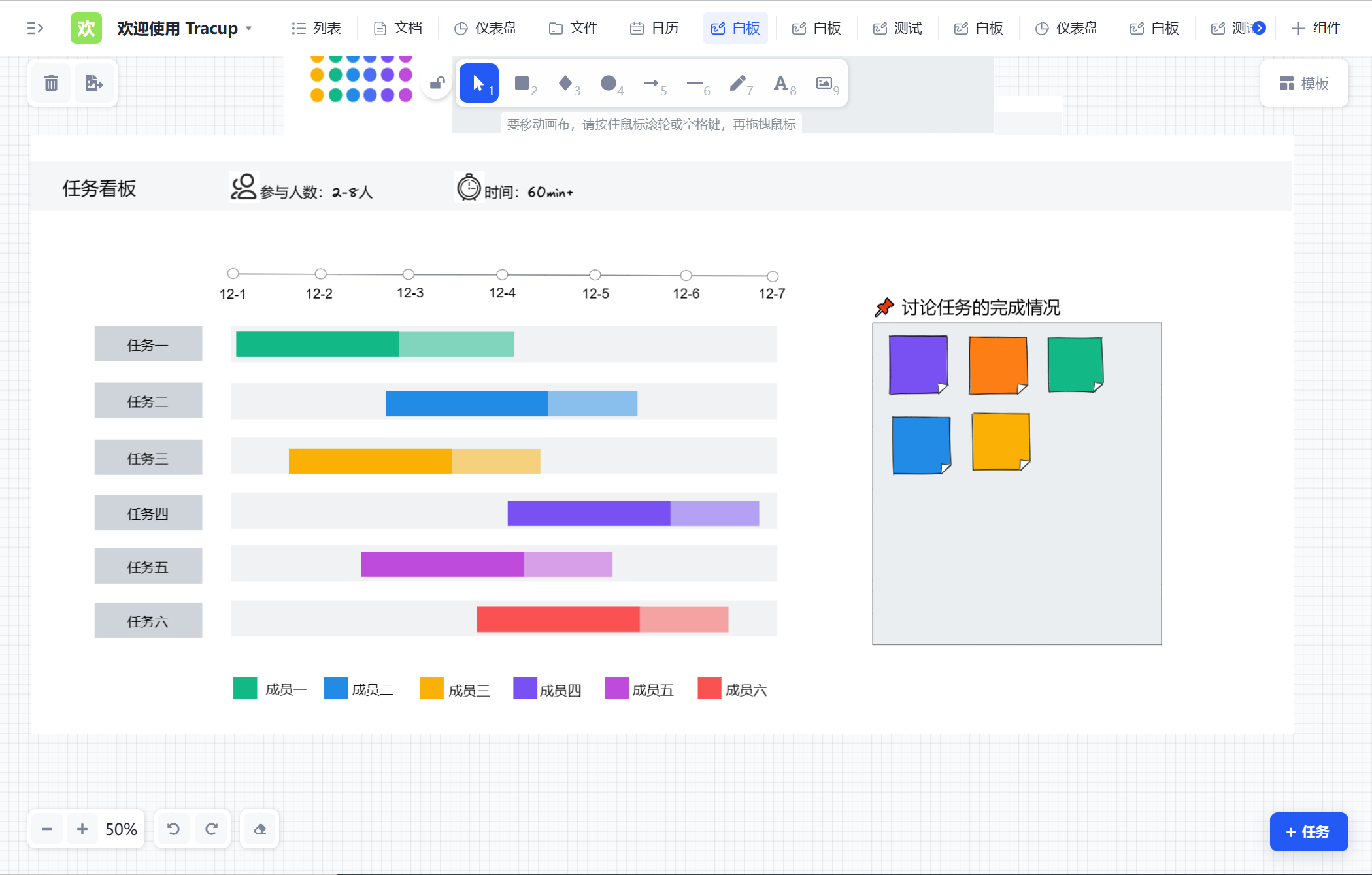 例如,Tracup 白板是一种流行的白板工具,可以帮助团队进行头脑风暴、构思、图形化规划和流程图等工作。团队成员可以在Miro上创建、编辑和共享各种图表、流程图、思维导图等,从而更好地沟通和协作。