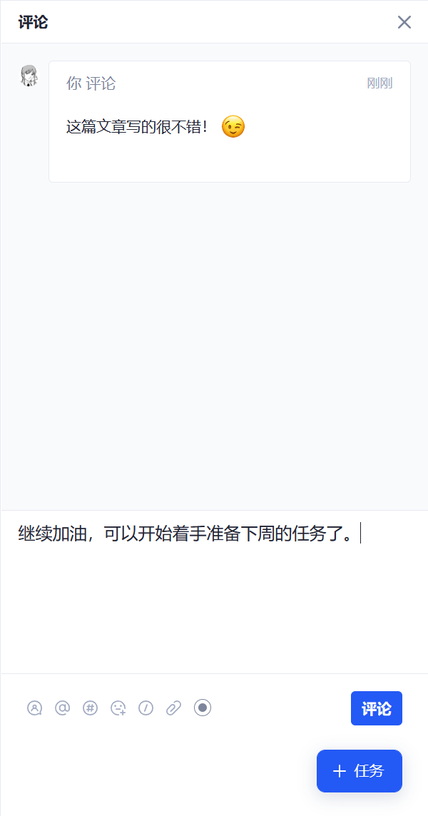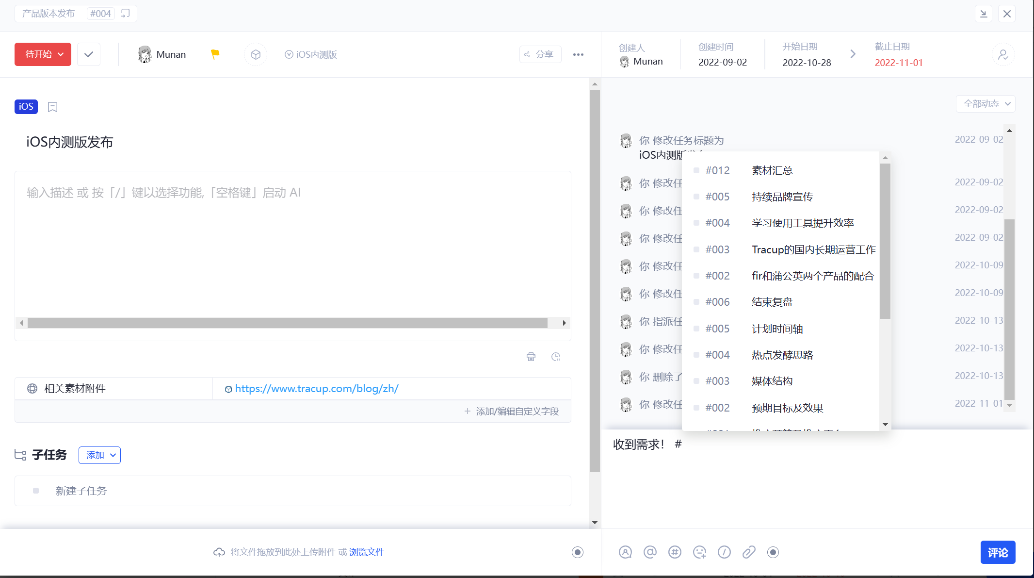 Tracup的任务评论功能允许团队成员就特定任务进行评论。在任务评论中,团队成员可以讨论任务的具体细节、提出问题、甚至提出解决方案。任务评论有助于团队成员更好地理解任务,并且让每个人都可以在任务中发挥自己的作用。此外,任务评论中的提醒功能可以帮助团队成员及时收到新的评论和回复。